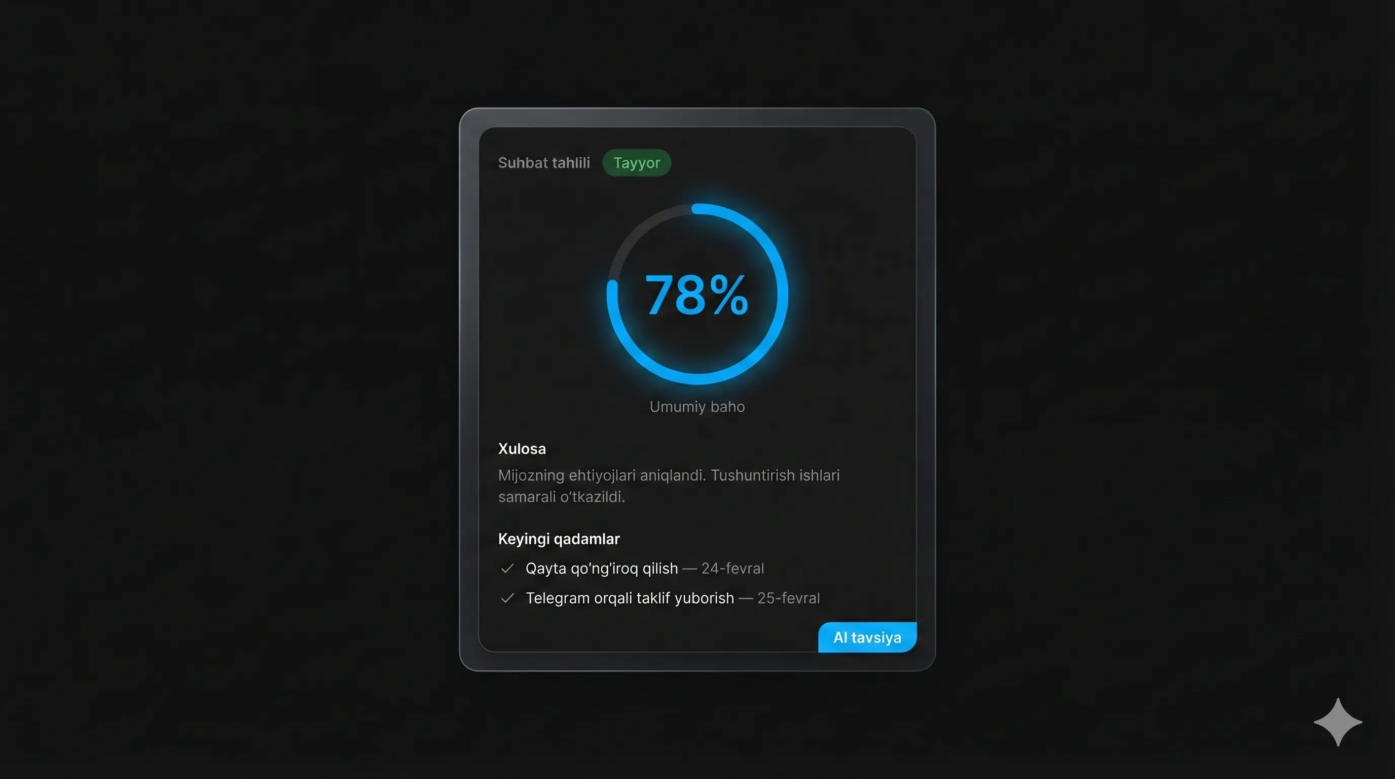 AI har bir suhbatni eshitadi, baholaydi va jamoangizga aniq yo'l ko'rsatadi. Hech bir qo'ng'iroq e'tiborsiz qolmaydi.